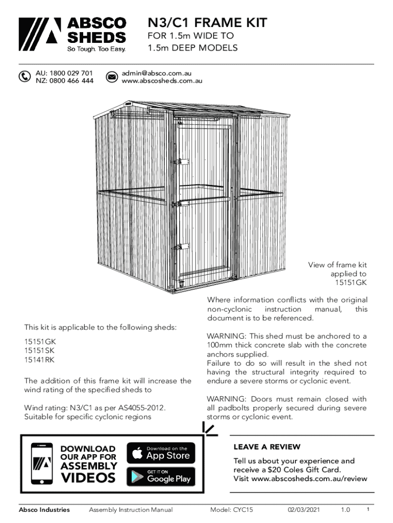 This instruction manual provides detailed guidelines for the assembly of the N3/C1 Frame Kit, which is designed for specific shed models to enhance wind resistance. The document outlines assembly steps, safety precautions, tools required, component lists, and warranty information, ensuring the structural integrity and assembly compliance for use in cyclonic regions.
