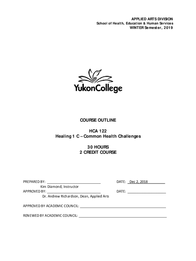 APPLIED ARTS DIVISIONSchool of Health, Education & Human ServicesWINTER Semester, 2019COURSE OUTLINE HCA 122 Healing 1 C Common Health Challenges 30 HOURS 2 CREDIT COURSEPREPARED BY: ___ Kim Diamond,