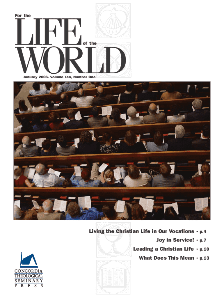 This issue of \'For the Life of the World\' focuses on the vital role of laity within the Christian Church and how dedicated individuals serve God in various vocations. It discusses the importance of recognizing and fulfilling one\'s calling in both church and everyday life, emphasizing Luther\'s doctrine of vocation.