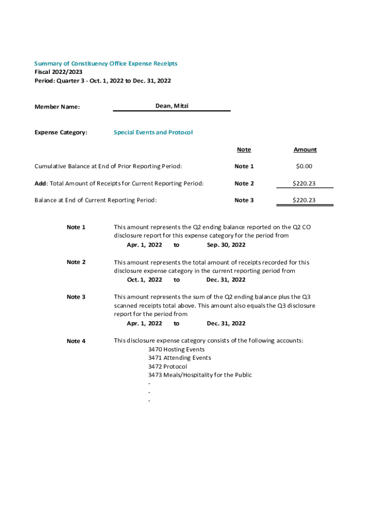 This document details the expense receipts for the constituency office of MLA Mitzi Dean for the third quarter of the fiscal year 2022/2023, covering the period from October 1, 2022, to December 31, 2022. It includes categories such as Special Events, Communications, Office Supplies, Travel, and Other Office Expenses, detailing amounts spent and cumulative balances.