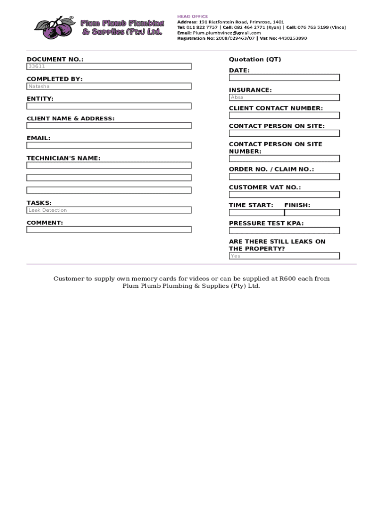 This document is a quotation for leak detection services provided by Plum Plumb Plumbing & Supplies (Pty) Ltd. It includes details about the service provided, pricing, terms and conditions, and responsibilities of the client. The quote specifies that clients must supply their own memory cards for video recordings, outlines payment requirements, and highlights the use of smoke testing technology. It also emphasizes that all work must be paid for in full and includes information on different...