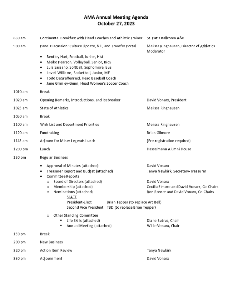 This document outlines the agenda for the AMA Annual Meeting scheduled for October 27, 2023, including the schedule of events, speakers, and key topics of discussion relevant to the Academy of Miner Athletics.