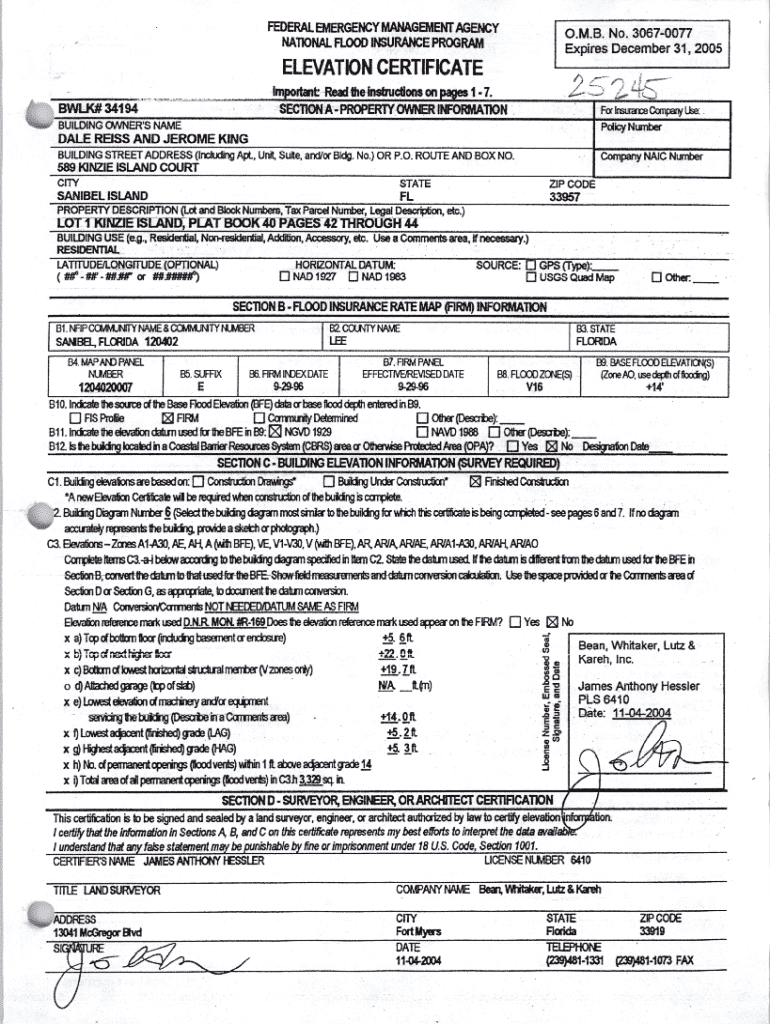 FEDERAL EMERGENCY MANAGEMENT AGENCY NATIONALINSURANCEFLOODO. M. B. No. 3067 0077PROGRAMDecember Decemm beerr 31, 2005ELEVATION CERTIFICATE 1)Important: Read BWLK# 34194414.the instructions on pages1