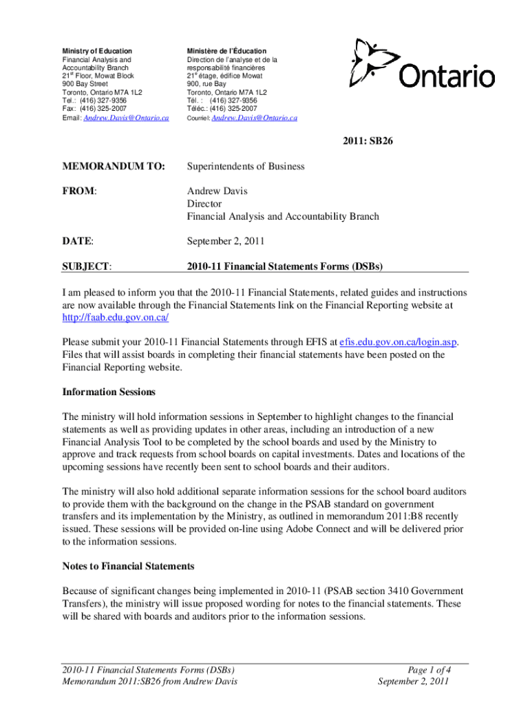 A memorandum from the Ministry of Education in Ontario detailing the submission requirements, guides, and updates related to the 2010-2011 financial statements for school boards. The document outlines important dates, changes to reporting standards, and instructions for submission to ensure compliance with the ministry\'s guidelines.