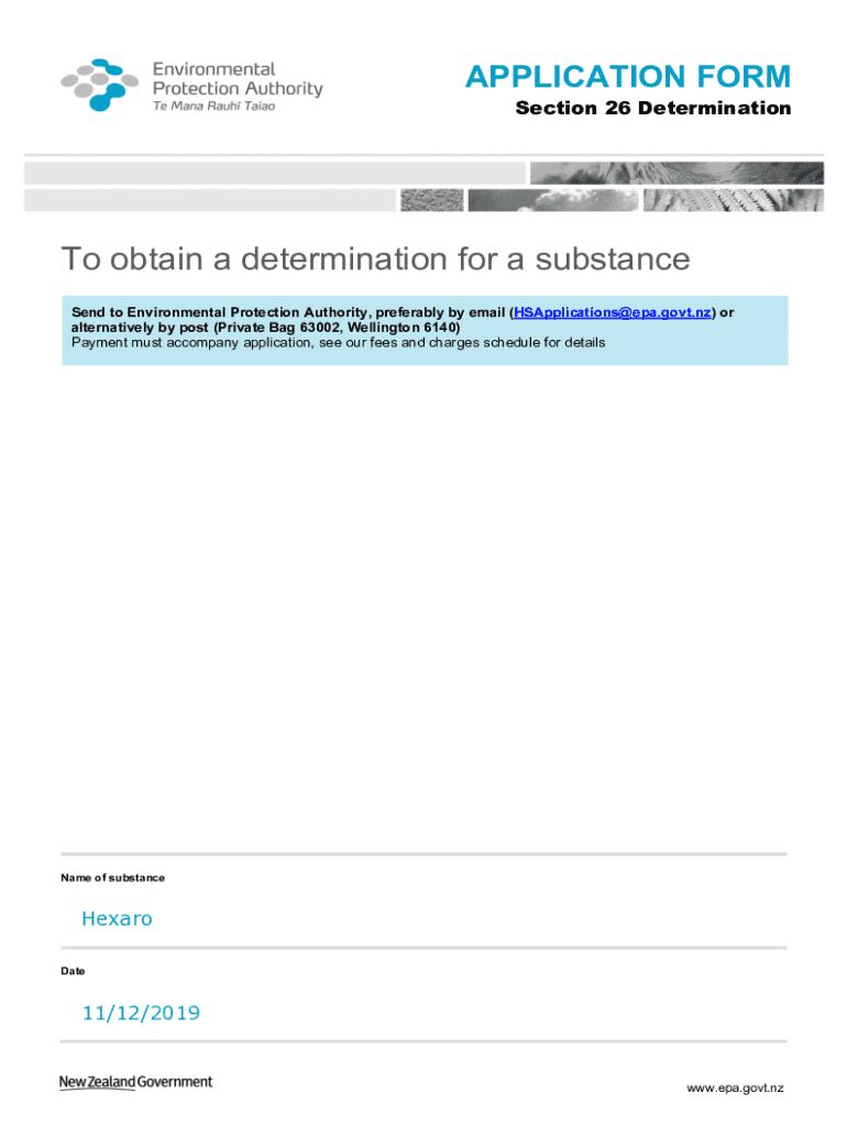 APPLICATION FORM Section 26 DeterminationTo obtain a determination for a substance Send to Environmental Protection Authority, preferably by email (HSApplications@epa.govt.nz) or alternatively by