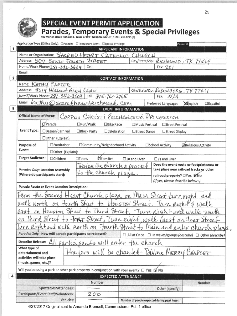 This document serves as an application form for organizing parades, temporary events, and special privileges within the city of Richmond, Texas. It includes sections for applicant information, event details, traffic control plans, and compliance with city regulations. The application must be filled out accurately and submitted for approval.