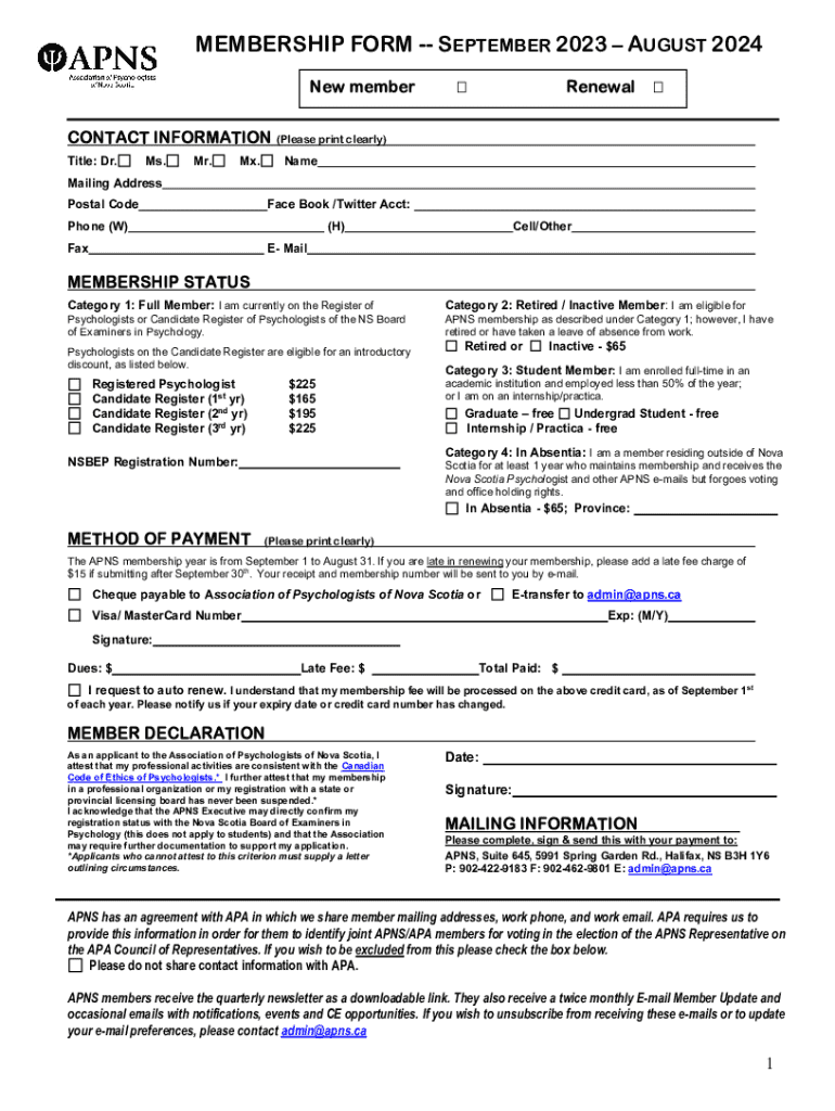 MEMBERSHIP FORM SEPTEMBER 2023 AUGUST 2024 New memberRenewalCONTACT INFORMATION (Please print clearly) Title: Dr.Ms.Mr.Mx.NameMailing Address Postal CodeFace Book /Twitter Acct:Phone (W)(H)FaxCell/OtherE