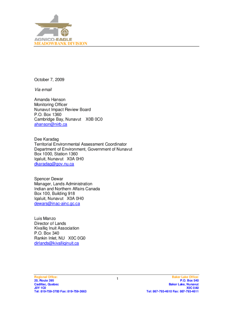 MEADOWBANK DIVISIONOctober 7, 2009 Via email Amanda Hanson Monitoring Officer Nunavut Impact Review Board P.O. Box 1360 Cambridge Bay, Nunavut X0B 0C0 ahanson@nirb.caDee Karadag Territorial Environmental