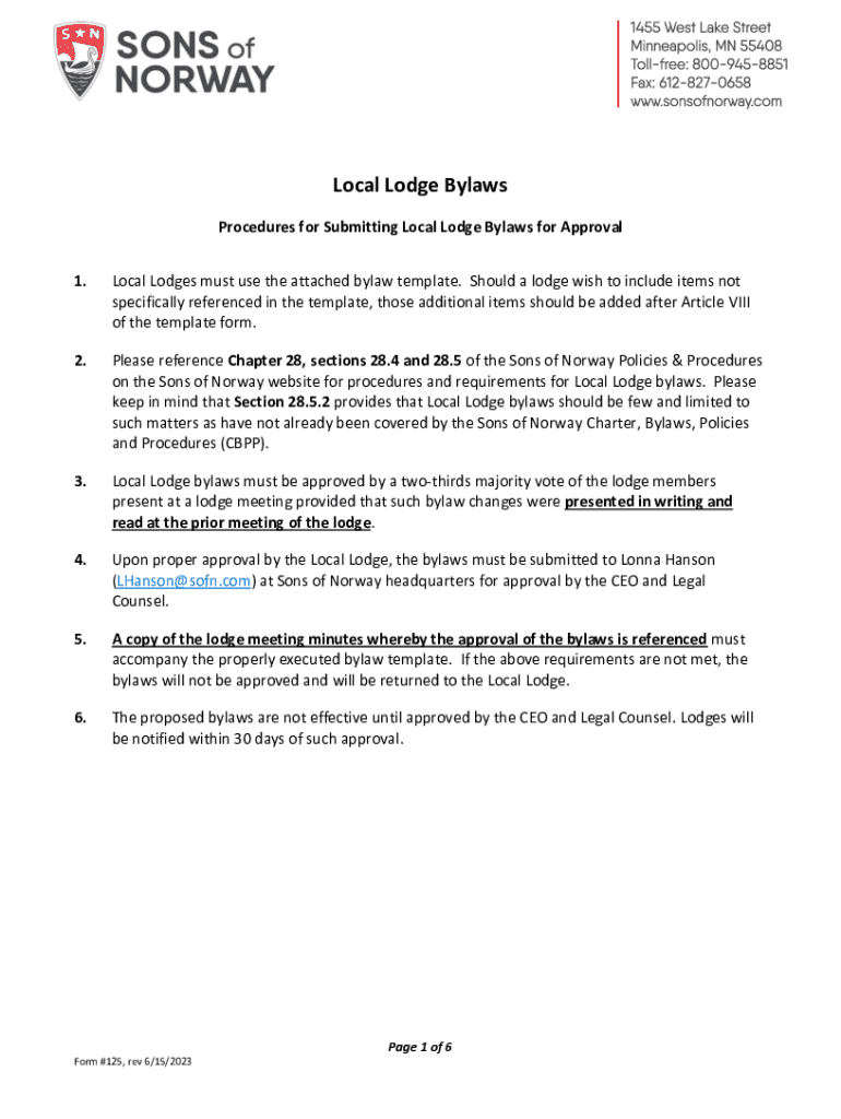 This document outlines the procedures for Local Lodges of the Sons of Norway to follow when submitting their bylaws for approval. It details the requirements, voting procedures, membership classifications, fees, compliance, and governance related to lodge operations. It includes articles on lodge meetings, membership qualifications, financial responsibilities, and the dissolution of the lodge.