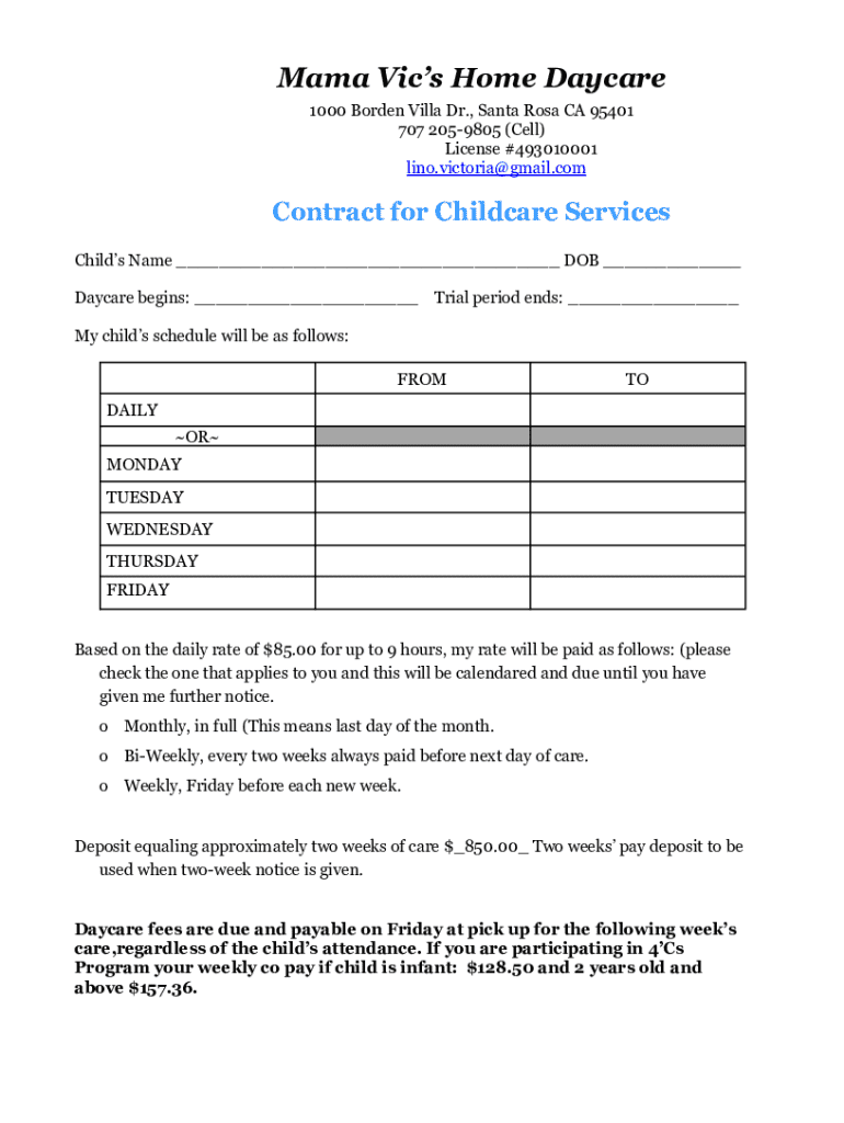 Mama Vics Home Daycare 1000 Borden Villa Dr., Santa Rosa CA 95401 707 2059805 (Cell) License #493010001 lino.victoria@gmail.comContract for Childcare Services Childs Name ___ DOB ___ Daycare begins: