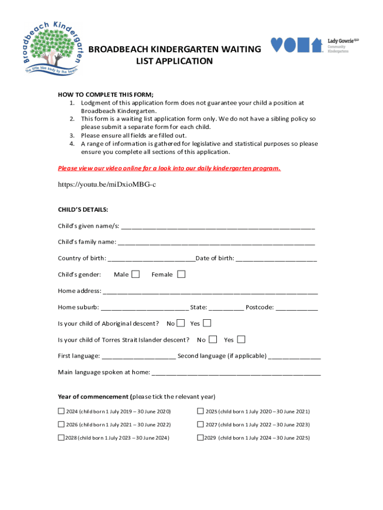 To fill out the Broadbeach kindergarten waiting list, parents should complete an application form available on the kindergarten's official website or at the facility. This typically involves providing details such as the child's name, date of birth, and contact information.