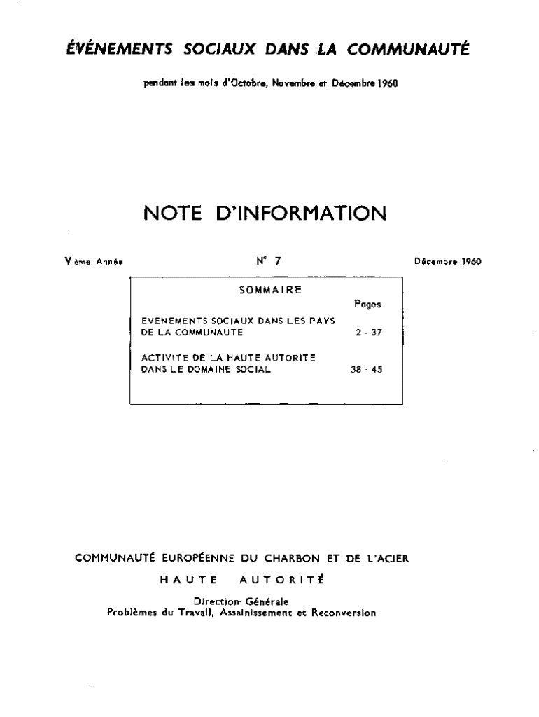 VNE.ME.NTS SOCIAUX DANS ].A COMMUNAUT pendant les mois d\'Octobre, Novembre et Dcembre 1960f/NOTE D\'INFORMATION V meAnneDcembre 1960SOMMAIRE Pages EVENEMENTS SOCIAUX DANS LES PAYS DE LA COMMUNAUTE