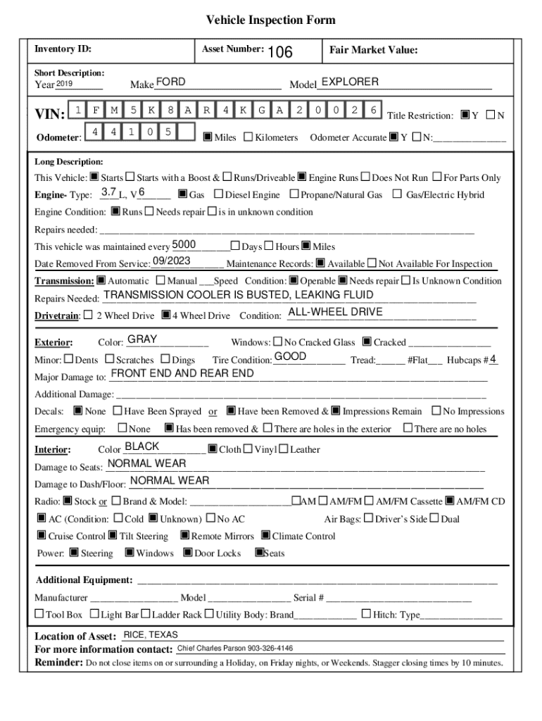 This document provides a detailed inspection report for a 2019 Ford Explorer, including information on its condition, maintenance history, and required repairs. The form contains sections to assess the vehicle\'s mechanical status, exterior and interior condition, and additional equipment. It serves as a comprehensive guide for evaluating the overall quality and readiness of the vehicle.