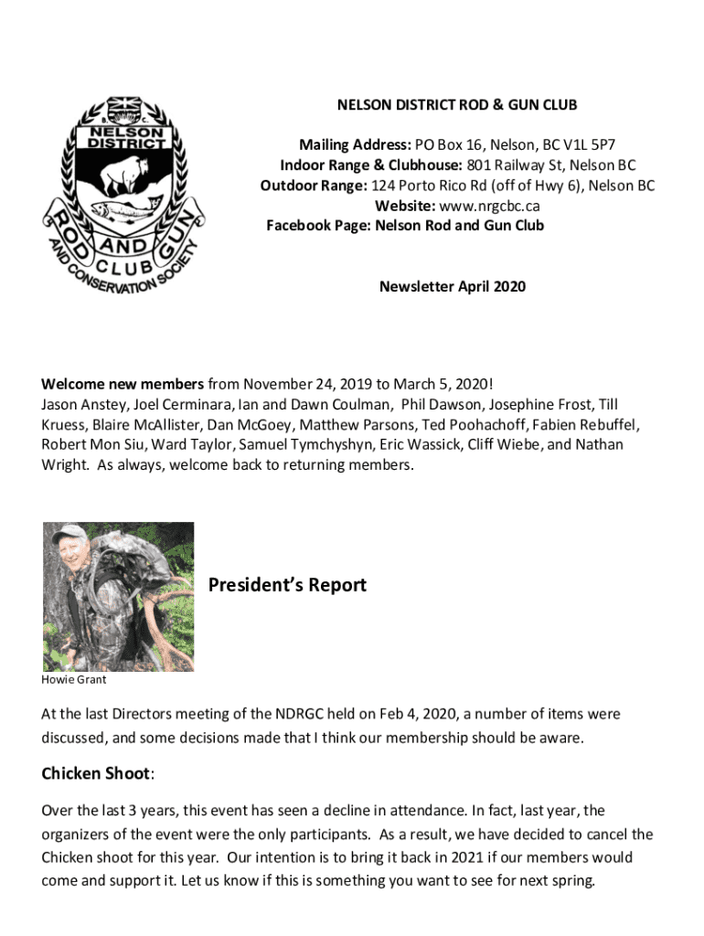 This document is the April 2020 newsletter for the Nelson District Rod & Gun Club, containing updates on club activities, membership information, financial contributions to local preservation efforts, upcoming events, and cancellations due to COVID-19.
