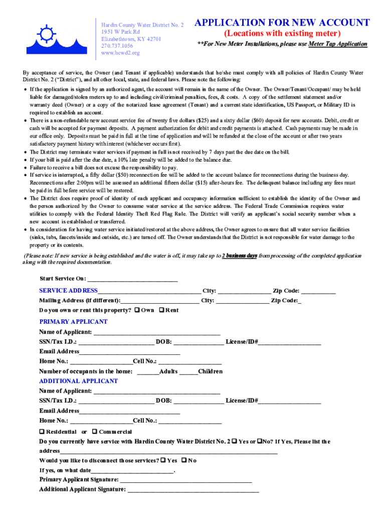 Hardin County Water District No. 2 1951 W Park Rd Elizabethtown, KY 42701 270.737.1056 www.hcwd2.orgAPPLICATION FOR NEW ACCOUNT (Locations with existing meter)**For New Meter Installations, please