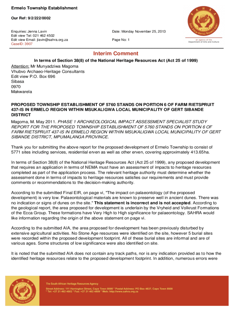 Ermelo Township Establishment Our Ref: 9/2/222/0002Enquiries: Jenna Lavin Edit view Tel: 021 462 4502 Edit view Email: jlavin@sahra.org.za CaseID: 3907Date: Monday November 25, 2013 Page No: 1Interim
