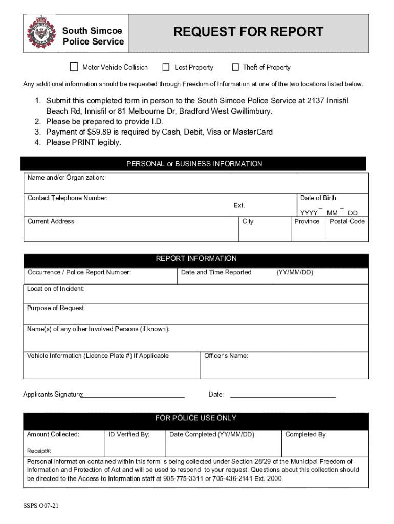 This document is a request form for obtaining reports related to motor vehicle collisions, lost property, and theft of property through the South Simcoe Police Service. It outlines the procedure for submitting requests, necessary identification, payment details, and information required from the requester.