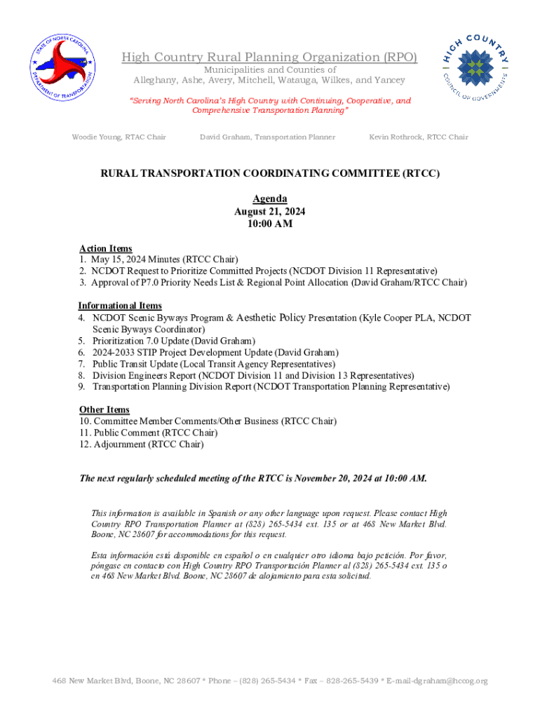 This document outlines the agenda for the Rural Transportation Coordinating Committee (RTCC) meeting held on August 21, 2024, including action items, informational items, and other business concerning transportation planning in North Carolina\'s High Country region.