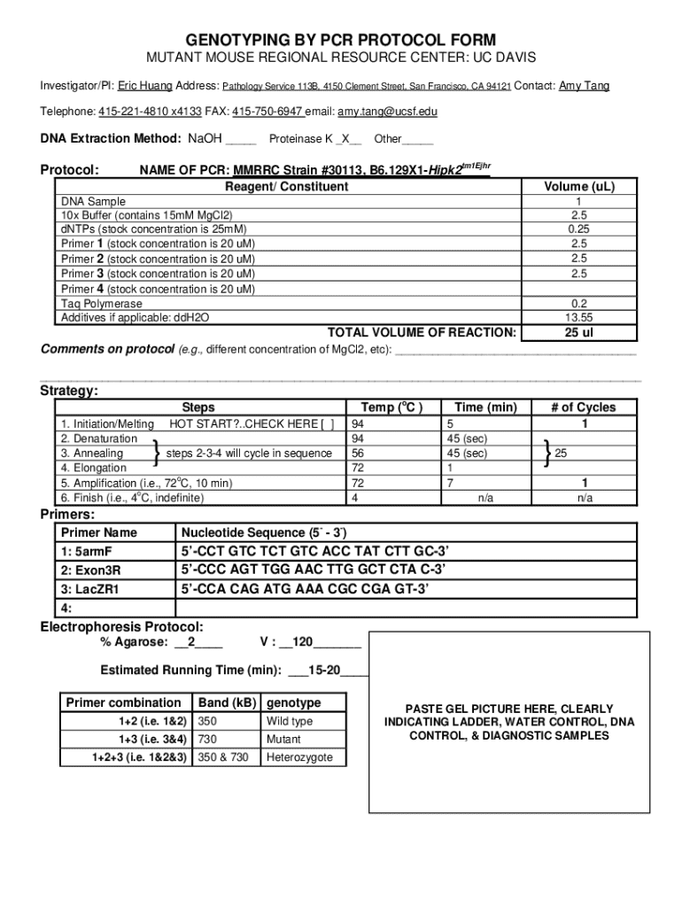 GENOTYPING BY PCR PROTOCOL FORM MUTANT MOUSE REGIONAL RESOURCE CENTER: UC DAVIS Investigator/PI: Eric Huang Address: Pathology Service 113B, 4150 Clement Street, San Francisco, CA 94121 Contact: Amy