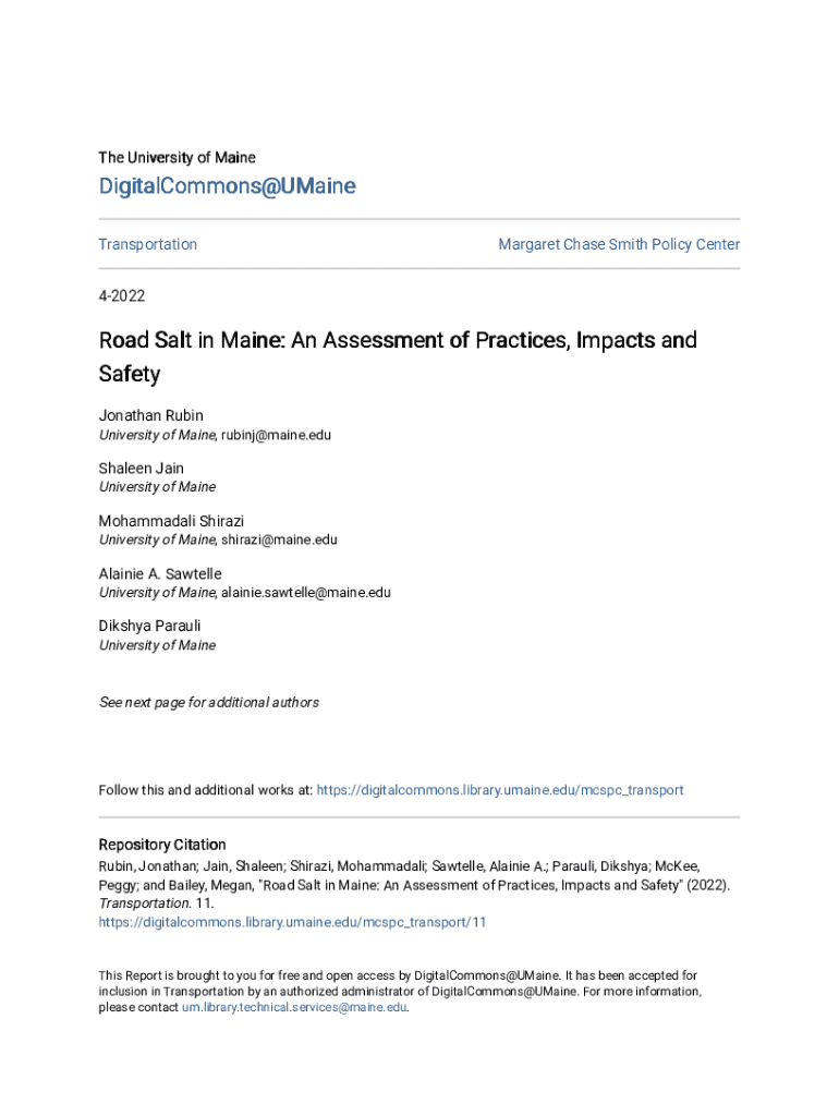 The University of MaineDigitalCommons@UMaine TransportationMargaret Chase Smith Policy Center42022Road Salt in Maine: An Assessment of Practices, Impacts and Safety Jonathan Rubin University of Maine,