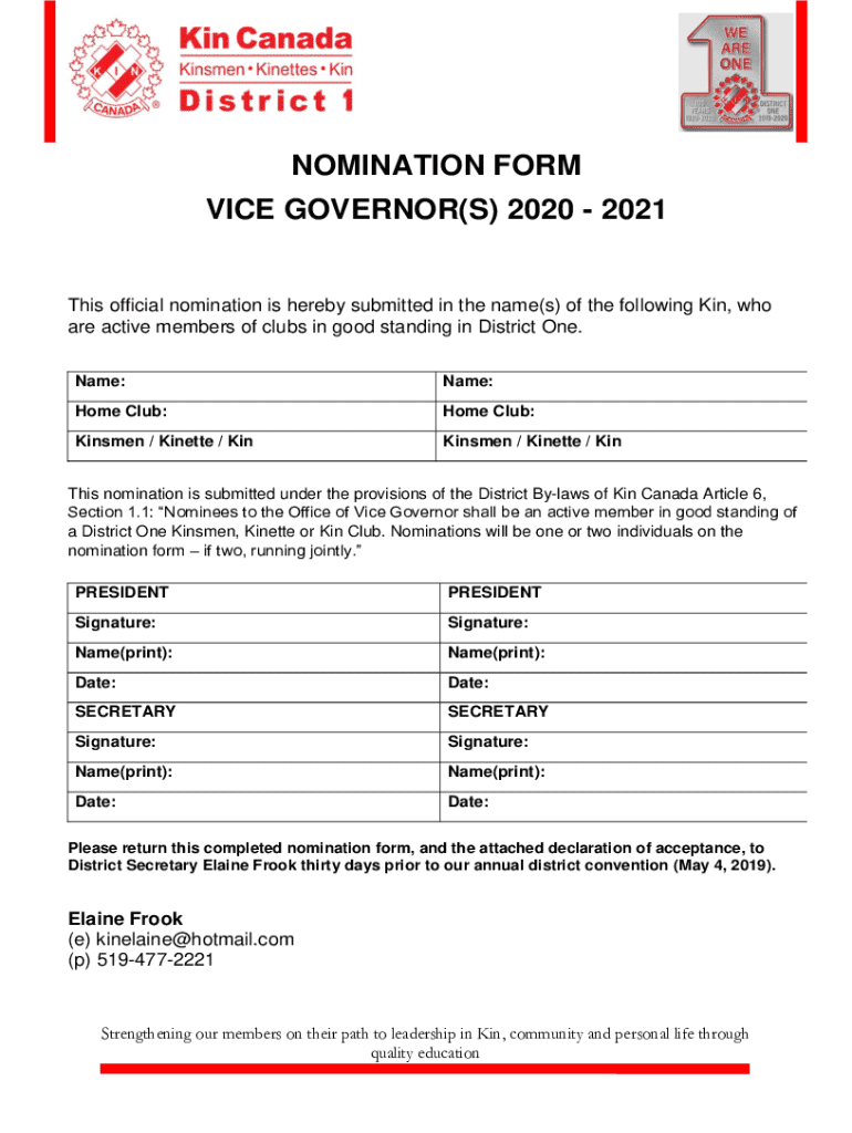 This document is a nomination form for individuals being nominated for the position of Vice Governor(s) in District One of Kin Canada for the years 2020 - 2021. It outlines the requirements for nominations, including the need for nominees to be active members in good standing of a Kinsmen, Kinette, or Kin Club. The form must be completed and submitted to the District Secretary thirty days prior to the annual district convention.