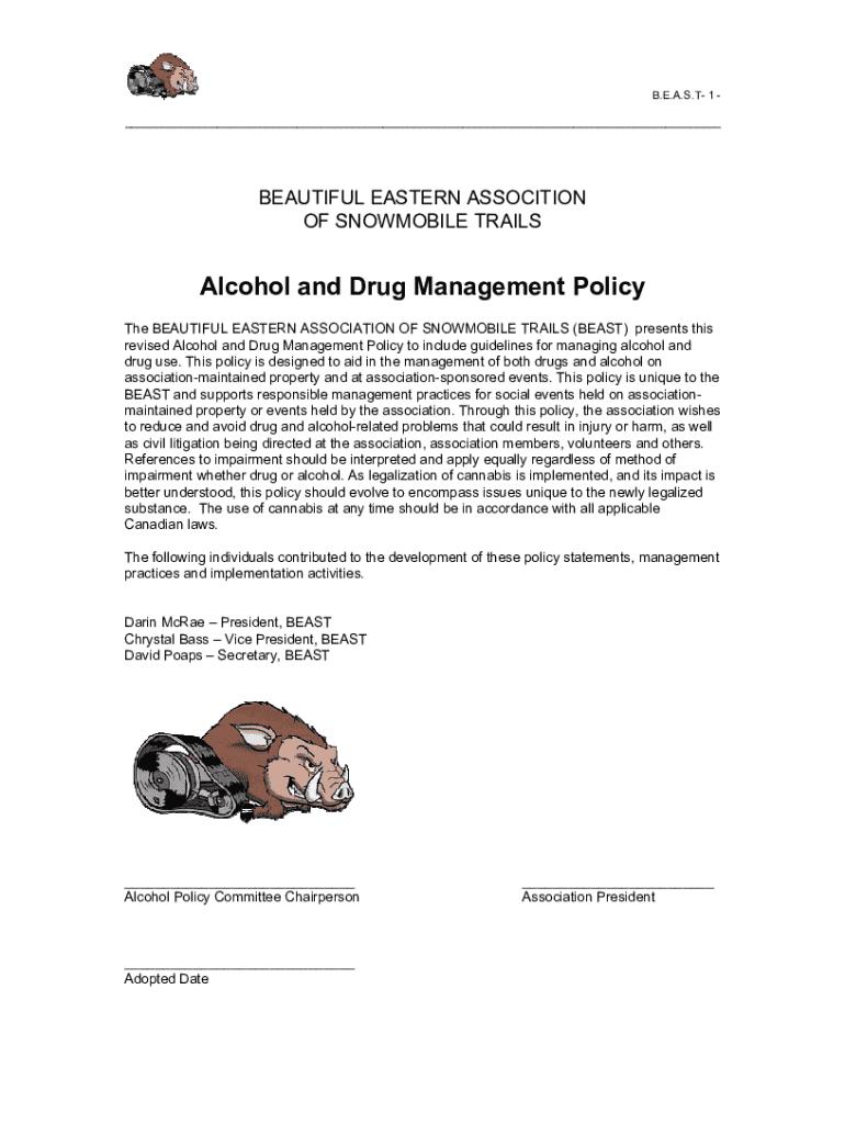 B.E.A.S.T 1 ___BEAUTIFUL EASTERN ASSOCITION OF SNOWMOBILE TRAILSAlcohol and Drug Management Policy The BEAUTIFUL EASTERN ASSOCIATION OF SNOWMOBILE TRAILS (BEAST) presents this revised Alcohol and