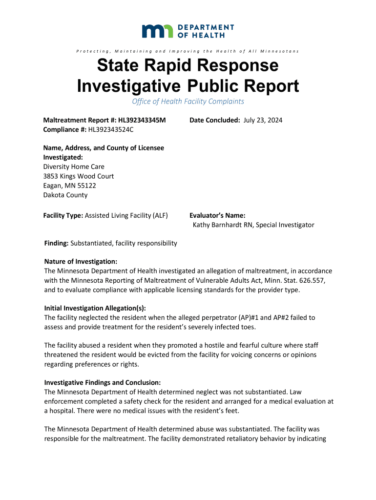 This report details an investigation into Diversity Home Care by the Minnesota Department of Health regarding allegations of maltreatment of residents, specifically neglect and abuse. While neglect was not substantiated, abuse was determined to be substantiated, with findings indicating violations of residents\' rights and retaliatory behavior against residents reporting concerns.