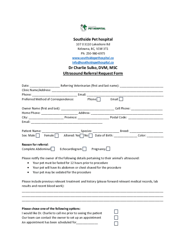 This document is a referral request form for ultrasound procedures at Southside Pet Hospital, detailing information required from the referring veterinarian and the pet owner. It includes guidelines for preparation before the procedure and consent options regarding appointment scheduling.