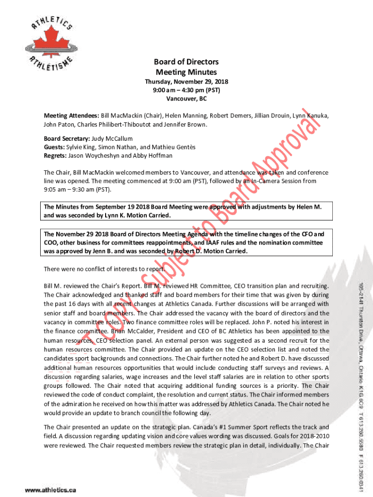 Board of Directors Meeting Minutes Thursday, November 29, 2018 9:00 am 4:30 pm (PST) Vancouver, BC Meeting Attendees: Bill MacMackin (Chair), Helen Manning, Robert Demers, Jillian Drouin, Lynn Kanuka,
