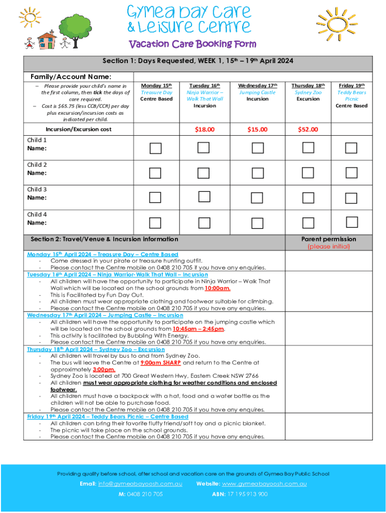 Get the free Aranda Afters Vacation Care Booking Form - Spring SVC ...