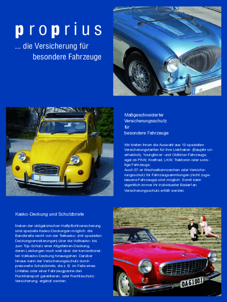 proprius ... die Versicherung fr besondere FahrzeugeMageschneiderter Versicherungsschutz fr besondere Fahrzeuge Wir bieten Ihnen die Auswahl aus 10 speziellen Versicherungstarifen fr Ihre Liebhaber