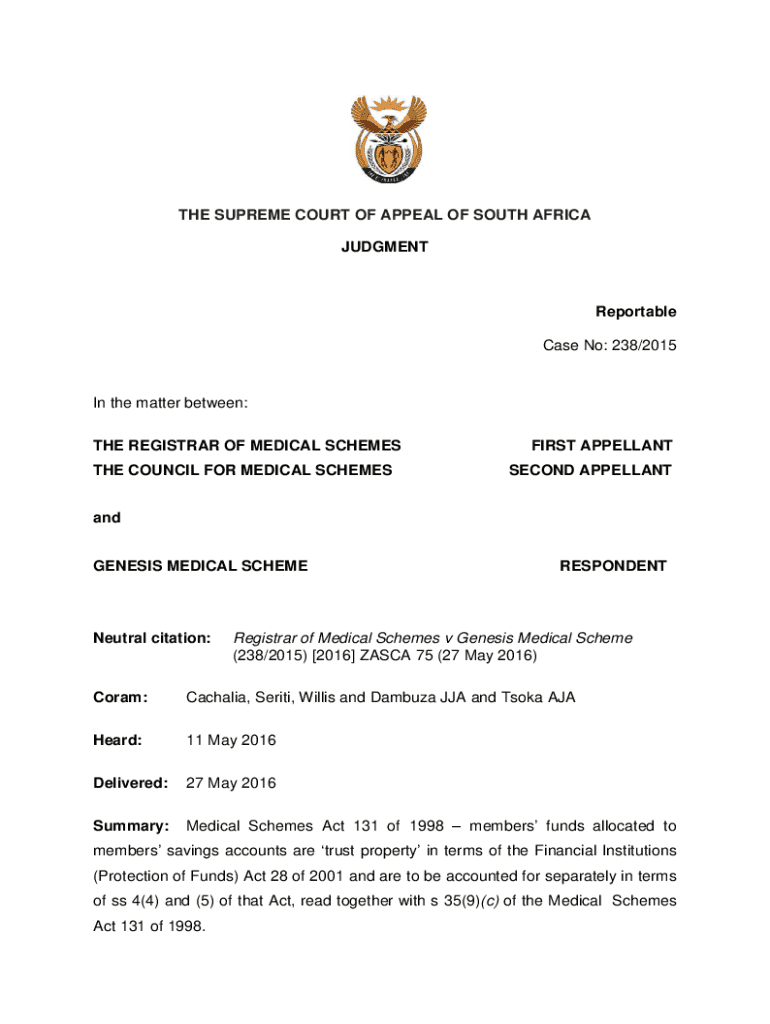 THE SUPREME COURT OF APPEAL OF SOUTH AFRICA JUDGMENTReportable Case No: 238/2015In the matter between: THE REGISTRAR OF MEDICAL SCHEMES THE COUNCIL FOR MEDICAL SCHEMESFIRST APPELLANT SECOND APPELLANTand