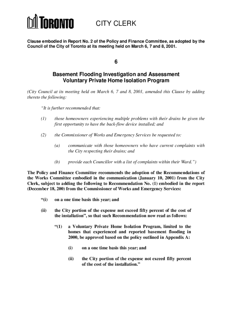 CITY CLERK Clause embodied in Report No. 2 of the Policy and Finance Committee, as adopted by the Council of the City of Toronto at its meeting held on March 6, 7 and 8, 2001.6 Basement Flooding Investigation
