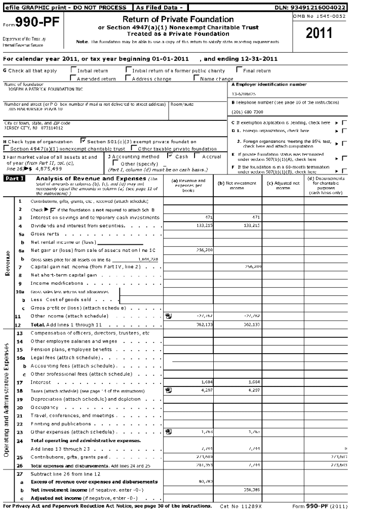 This document is the Return of Private Foundation Form 990-PF, filed for the calendar year 2011. It provides a comprehensive financial report of the JOSEPH A PATRICK FOUNDATION INC, showcasing its revenue, expenses, assets, liabilities, grants, and contributions to various charitable causes. Key details include the organization’s purpose, financial activities, and compliance with federal tax regulations concerning private foundations.