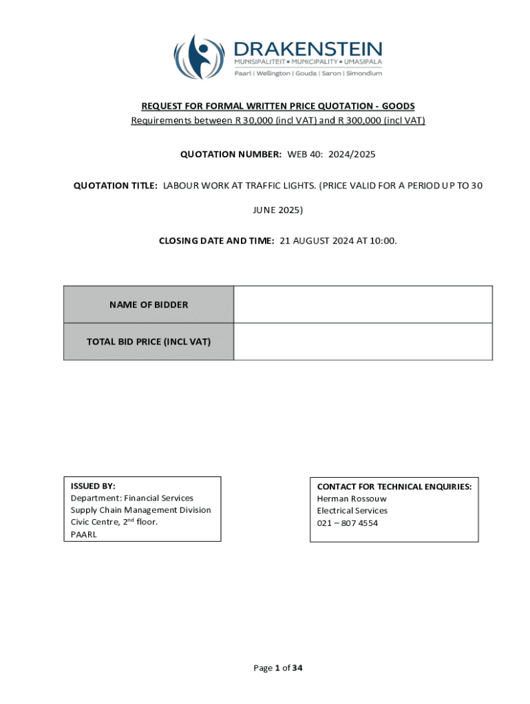 REQUEST FOR FORMAL WRITTEN PRICE QUOTATION GOODS Requirements between R 30,000 (incl VAT) and R 300,000 (incl VAT) QUOTATION NUMBER: WEB 40: 2024/2025 QUOTATION TITLE: LABOUR WORK AT TRAFFIC LIGHTS.