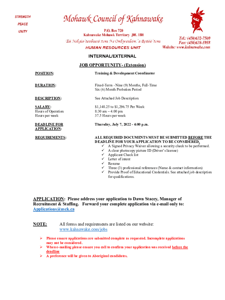 This document outlines a job opportunity for the position of Training & Development Coordinator at the Mohawk Council of Kahnawake. It includes details about the job duration, salary, application requirements, roles and responsibilities, decision-making authority, and qualifications needed for the position.