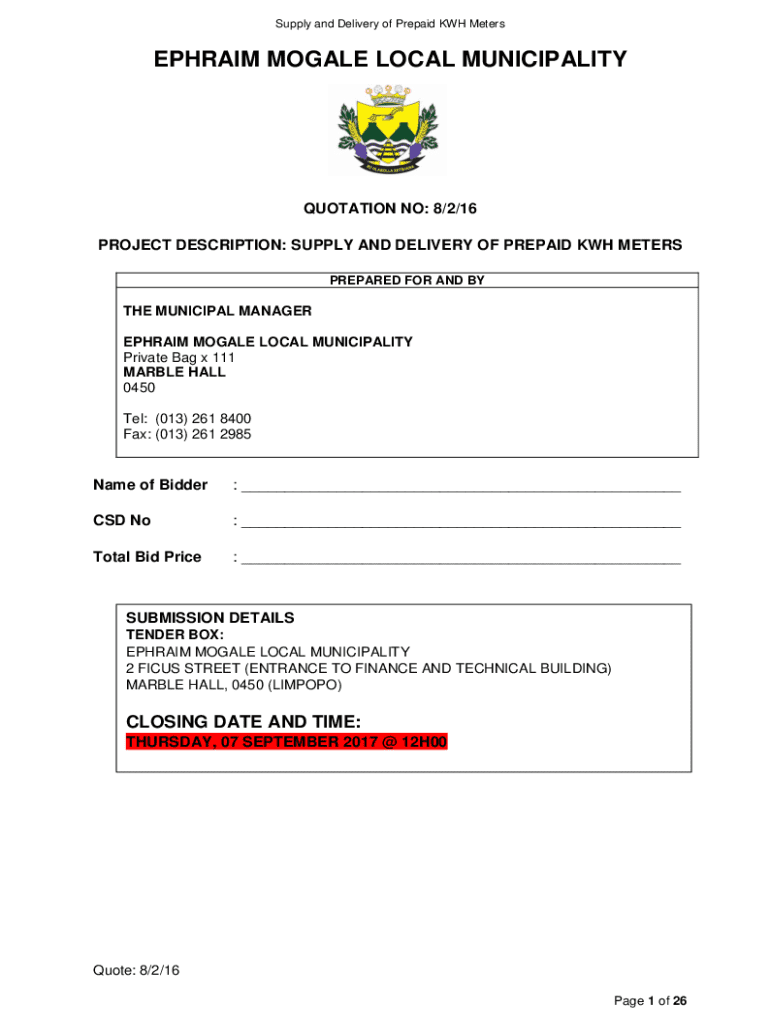This document invites quotations from qualified service providers for the supply and delivery of prepaid KWH meters for the Ephraim Mogale Local Municipality. It outlines submission requirements, evaluation criteria, and detailed specifications for the meters needed, as well as the bidding process and conditions regarding local content and compliance.