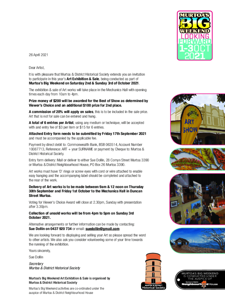 26 April 2021 Dear Artist, It is with pleasure that Murtoa & District Historical Society extends you an invitation to participate in this years Art Exhibition & Sale, being conducted as part of Murtoas