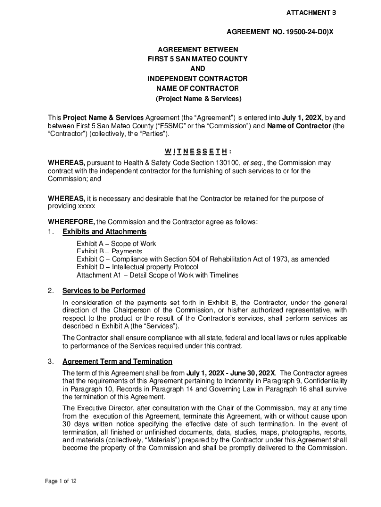 ATTACHMENT BAGREEMENT NO. 1950024D0)X AGREEMENT BETWEEN FIRST 5 SAN MATEO COUNTY AND INDEPENDENT CONTRACTOR NAME OF CONTRACTOR (Project Name & Services) This Project Name & Services Agreement (the