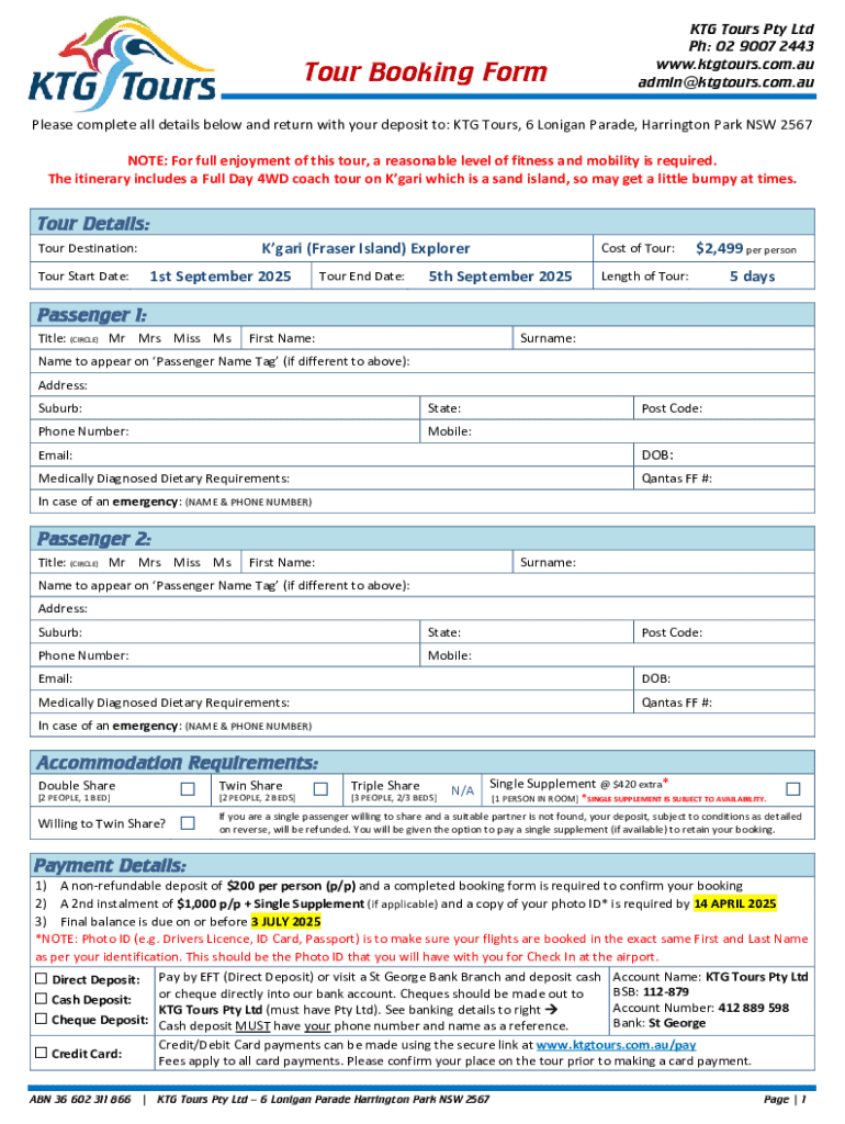 Tour Booking FormKTG Tours Pty Ltd Ph: 02 9007 2443 www.ktgtours.com.au admin@ktgtours.com.auPlease complete all details below and return with your deposit to: KTG Tours, 6 Lonigan Parade, Harrington