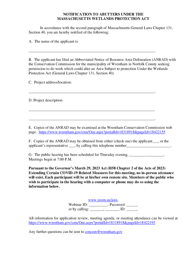 Get the free Notification to Abutters Under the Mass Wetlands ...