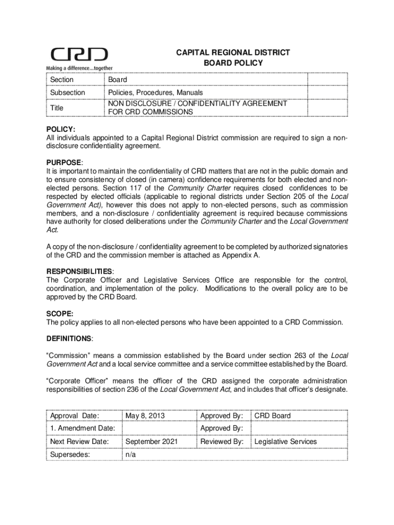 CAPITAL REGIONAL DISTRICT BOARD POLICY SectionBoardSubsectionPolicies, Procedures, ManualsTitleNON DISCLOSURE / CONFIDENTIALITY AGREEMENT FOR CRD COMMISSIONSPOLICY: All individuals appointed to a