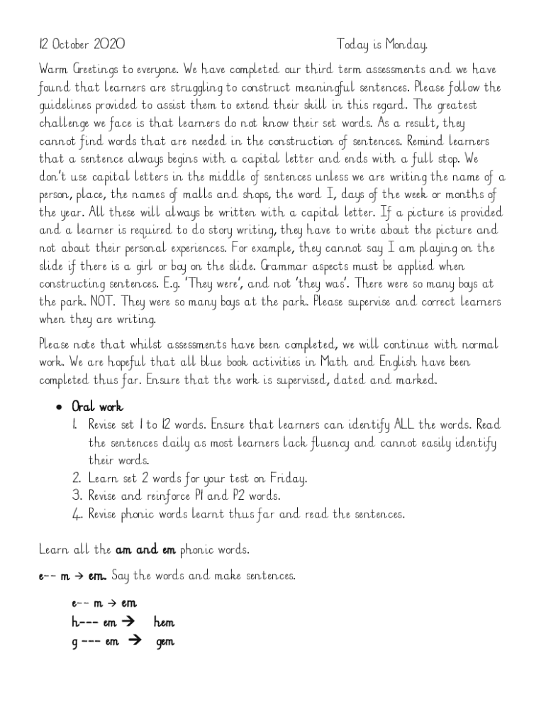 12 October 2020Today is Monday.Warm Greetings to everyone. We have completed our third term assessments and we have found that learners are struggling to construct meaningful sentences. Please follow