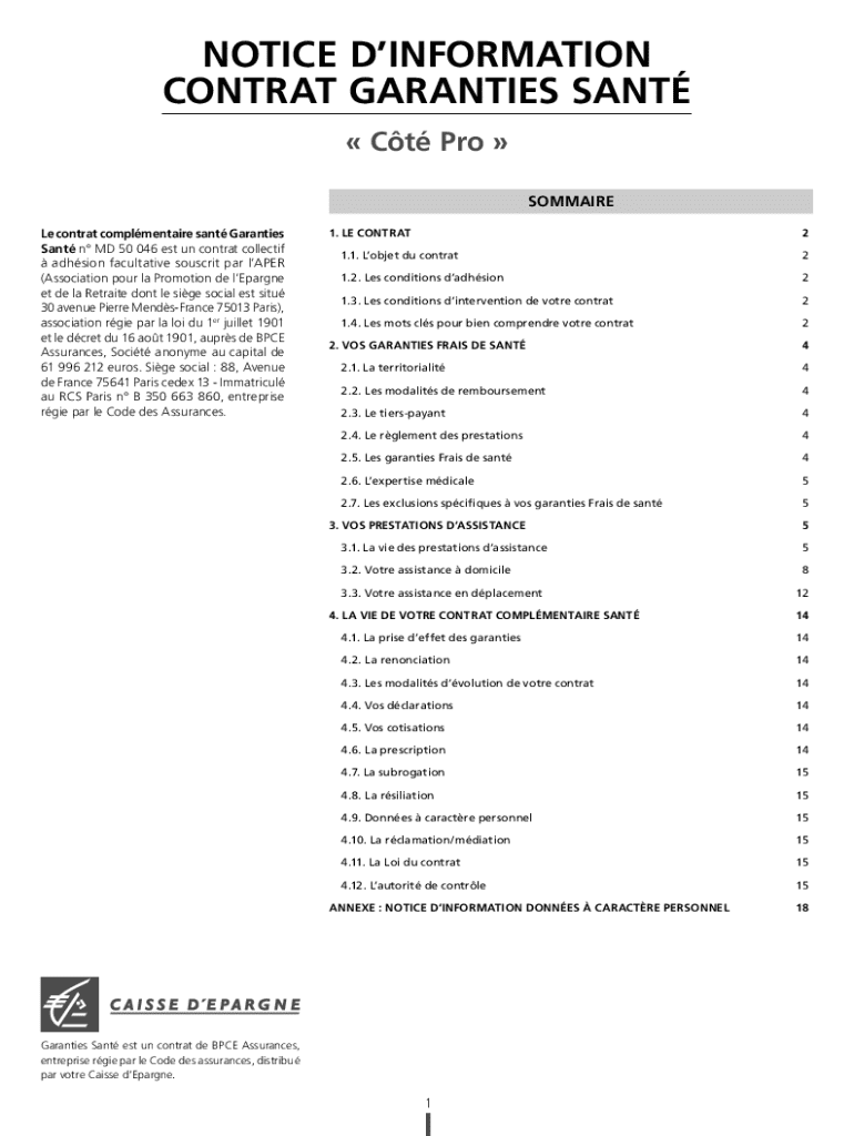 NOTICE DINFORMATION CONTRAT GARANTIES SANT Ct Pro SOMMAIRE Le contrat complmentaire sant Garanties Sant n MD 50 046 est un contrat collectif adhsion facultative souscrit par lAPER (Association pour