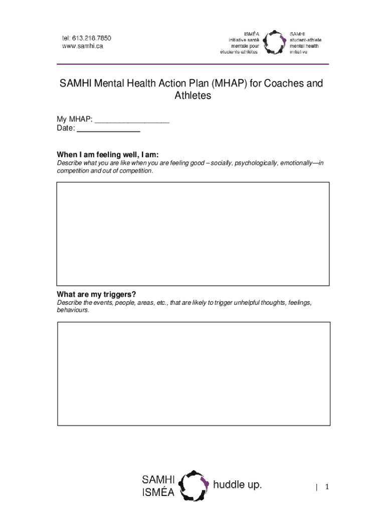 SAMHI Mental Health Action Plan (MHAP) for Coaches and Athletes My MHAP: ___ Date: When I am feeling well, I am: Describe what you are like when you are feeling good socially, psychologically, emotionallyin