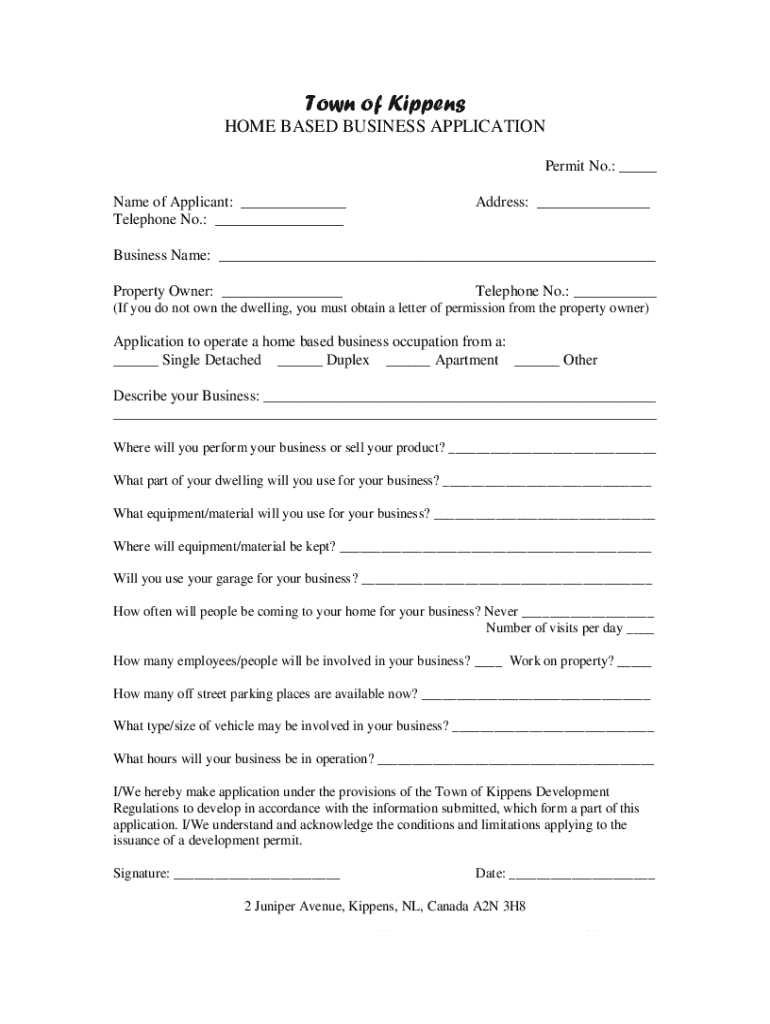Town of Kippens HOME BASED BUSINESS APPLICATION Permit No.: ___ Name of Applicant: ___ Telephone No.: ___Address: ___Business Name: ___ Property Owner: ___Telephone No.: ___(If you do not own the