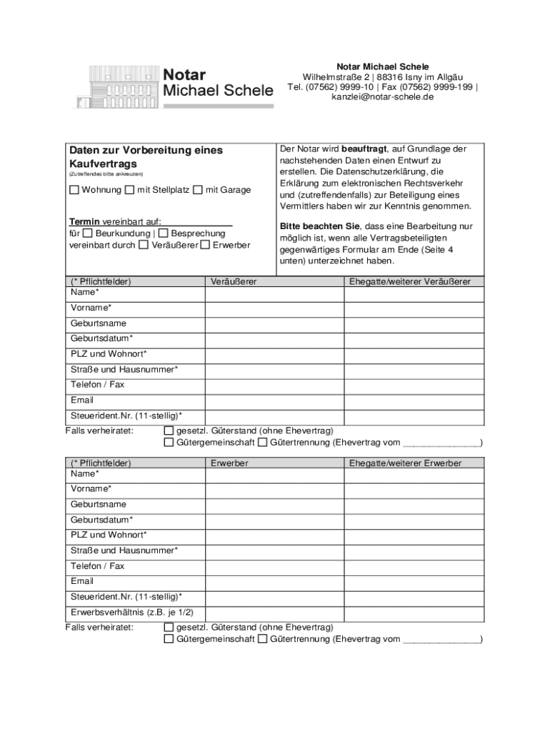 Notar Michael Schele Wilhelmstrae 2 | 88316 Isny im Allgu Tel. (07562) 999910 | Fax (07562) 9999199 | kanzlei@notarschele.deDaten zur Vorbereitung eines Kaufvertrags (Zutreffendes bitte ankreuzen)Wohnungmit