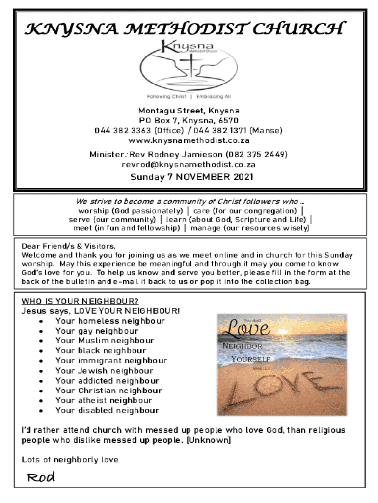 This bulletin provides information about the Knysna Methodist Church\'s worship service, community initiatives, church activities, and financial contributions. It emphasizes the church\'s mission of love, inclusivity, and service to the community while inviting engagement from attendees and visitors.