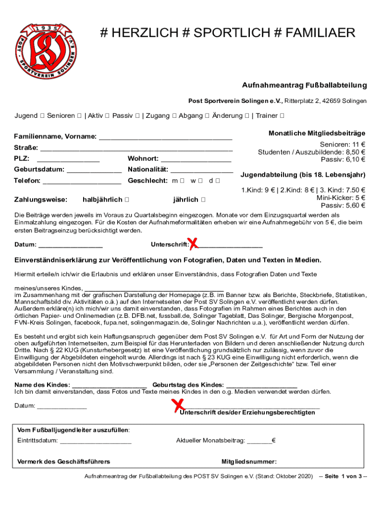 # HERZLICH # SPORTLICH # FAMILIAERAufnahmeantrag Fuballabteilung Post Sportverein Solingen e.V., Ritterplatz 2, 42659 SolingenJugendSenioren| AktivPassiv| ZugangAbgangnderung| TrainerFamilienname,