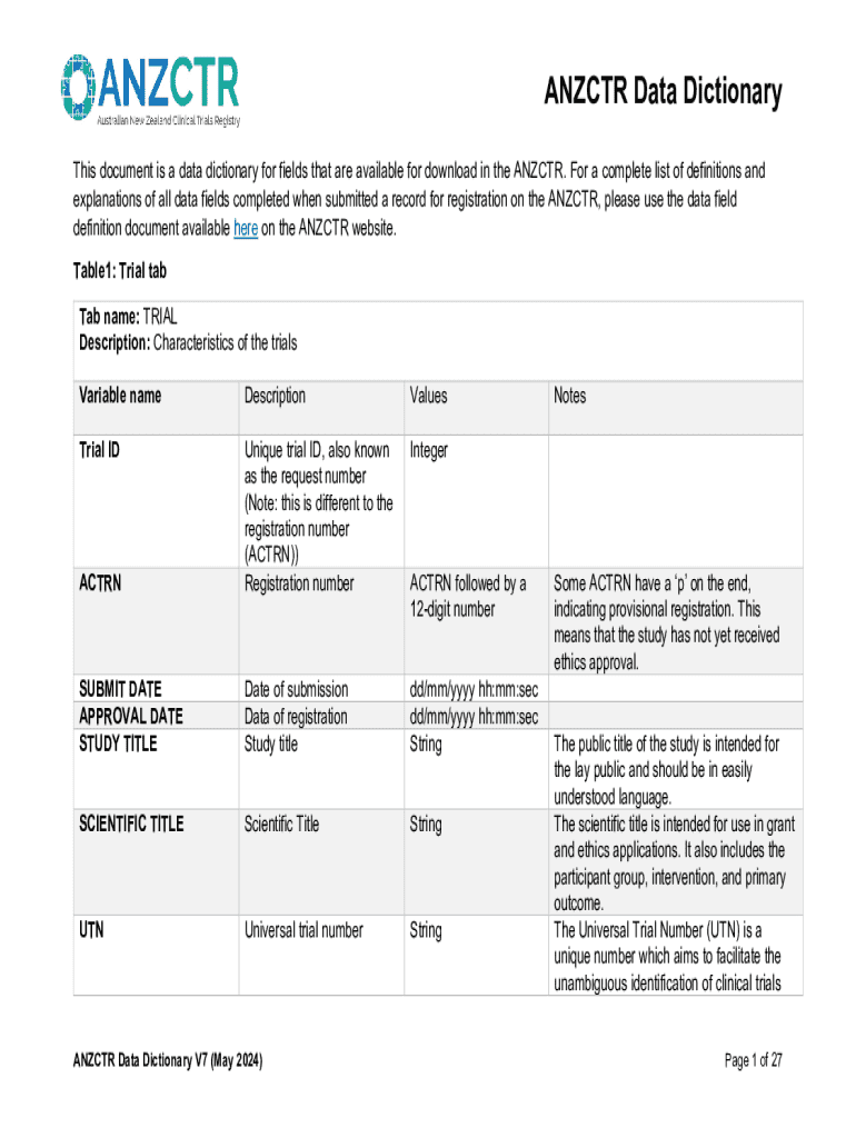 Get the free Anzctr Data Dictionary